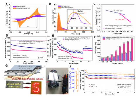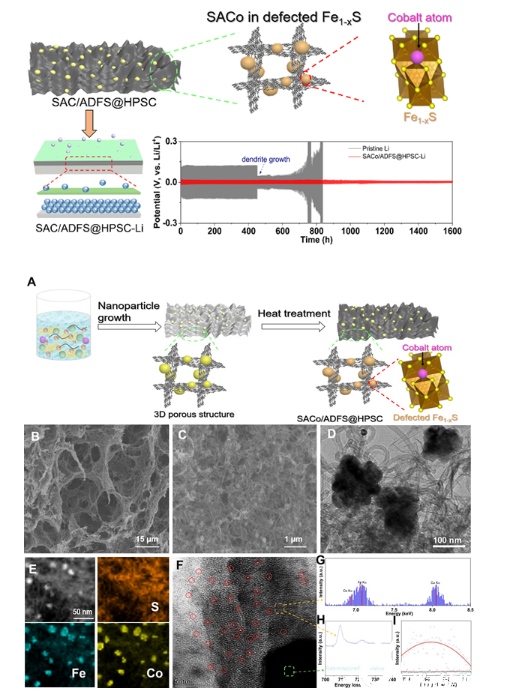 為此,中國科學(xué)院蘇州納米技術(shù)與納米仿生研究所博士王健與研究員藺洪振,首次提出利用缺陷位點(diǎn)來錨定金屬單原子的方法,將高活性金屬單原子錨定在陽離子缺陷化合物中作為鋰離子動力學(xué)調(diào)控層,實現(xiàn)對鋰離子動力學(xué)的催化,豐富的金屬單原子活性位點(diǎn)可引導(dǎo)鋰以較低的能壘均勻成核,并促進(jìn)鋰金屬表面的無枝晶化過程。與常規(guī)的納米碳材料相比較,陽離子缺陷金屬硫化物比納米碳具有更好的親鋰性。缺陷位點(diǎn)能夠捕獲并錨定金屬單原子,利用球差矯正電鏡與X射線吸收光譜表征了鈷單原子的形貌與化學(xué)環(huán)境,并通過能量散射譜分析了鈷原子和鐵原子的價態(tài)特征,確認(rèn)了Fe1-xS和鈷單原子的存在形態(tài)?! 「呋钚缘脑游稽c(diǎn)使SACo/ADFS@HPSC具有協(xié)同親鋰和催化鋰離子動力學(xué)的效應(yīng)能夠顯著調(diào)控鋰沉積行為。活性金屬單原子位點(diǎn)降低了鋰成核勢壘,促進(jìn)鋰的均勻水平沉積,從而獲得1600 h的超長壽命和較高的庫侖效率,有效阻止了鋰沉積過程中的枝晶生長,并對循環(huán)后的電極形貌進(jìn)行了表征與機(jī)制研究。與常規(guī)的SACs一樣,SACo/ADFS@HPSC調(diào)控層對多硫化物的催化、硫化鋰的沉積有明顯催化作用。調(diào)控的鋰金屬作為負(fù)極與硫正極匹配后,鋰硫全電池的硫利用率和倍率性能顯著提高,倍率最高可達(dá)10 C。在1 mA cm-2下,制備的硫面積載量為5.4 mg cm-2的軟包電池的面容量為3.78 mA cm-2,體現(xiàn)出較好的實際應(yīng)用前景。該工作提供了一種利用催化材料來控制均勻剝離和沉積鋰的表面電化學(xué)行為的新策略。