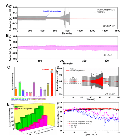 圖3.SACo/ADFS@HPSC調(diào)控層提升鋰金屬電極的電化學(xué)穩(wěn)定性和壽命