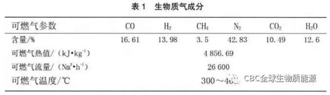 該生物質(zhì)氣耦合燃煤發(fā)電項目與某百萬千瓦超超臨界燃煤鍋爐耦合,生物質(zhì)氣化部分采用常壓循環(huán)流化床氣化爐,生物質(zhì)原料經(jīng)過預(yù)處理加工之后,送入氣化爐,完成高效氣化(氣化后出口溫度為720?850℃),可燃氣體經(jīng)過除塵凈化、回收余熱降低溫度至400℃左右,經(jīng)在線檢測和計量后,燃氣送至鍋爐內(nèi)燃氣燃燒器與煤粉進行分級混燒(兩臺鍋爐為母管制)。該生物質(zhì)氣賴合燃煤發(fā)電項目利用原發(fā)電系統(tǒng)實現(xiàn)高效發(fā)電,生物質(zhì)氣化發(fā)電部分總裝機規(guī)模為15MW,工程建成后每年需用玉米秸稈、花生殼及其它農(nóng)林生產(chǎn)廢棄物可達11萬t,可節(jié)約標(biāo)準煤近3.26萬t,相應(yīng)地減排燃煤所產(chǎn)生的SO2約為272萬t,減排溫室效應(yīng)氣體CO2約8.42萬t。生物質(zhì)氣成分見表1。