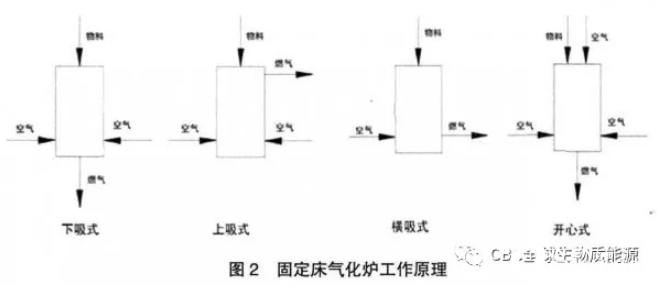根據(jù)固定床爐內(nèi)氣體流動方向的不同,將固定床分為四種爐型:下吸式、上吸式、橫吸式和開心式氣化爐[4],固定床氣化爐工作原理如圖2所示。下吸式氣化爐結(jié)構(gòu)較簡單、工作穩(wěn)定,可隨時開蓋添料,出爐可燃氣焦油雜質(zhì)含量較少,該氣化爐主要應(yīng)用在發(fā)電方面,目前中國和印度使用較多。燃氣在上吸式氣化爐內(nèi)經(jīng)過熱解層和干燥層時進行熱量的多向傳遞,并進行物料的熱分解和干燥,降低了燃氣自身的溫度,此種氣化爐結(jié)構(gòu)簡單、運行方便、氣化效率高、氣體熱值高、含塵量低。橫吸式氣化爐內(nèi),通過單管進風(fēng)噴嘴高速吹入空氣,形成一個高溫燃燒區(qū)(達2000t),此類型的氣化爐生產(chǎn)強度高,適合氣化較難燃燒的生物質(zhì)物料。生物質(zhì)物料和空氣自開心式氣化爐爐頂進入,反應(yīng)溫度沿反應(yīng)截面分布均勻,由于氣、固兩相同向流動,有利于焦油的裂解,生物質(zhì)燃氣中焦油含量較低,該爐型生產(chǎn)強度在幾種固定床中居首位。