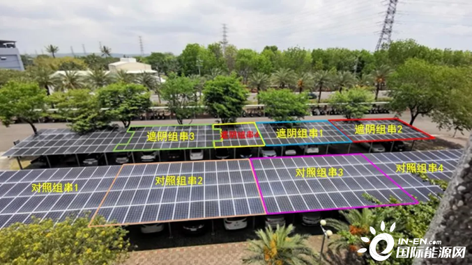 前側車棚上的組串受樹木遮擋嚴重(含遮陰組串1、2、3和4),后側車棚則處于相對開闊地帶,無外部環(huán)境陰影遮擋(含對照組串1、2、3和4)。