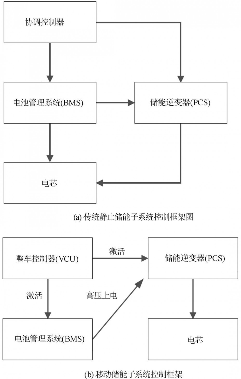 文獻(xiàn)的靜止儲(chǔ)能協(xié)調(diào)控制框架為: BMS和PCS將全部數(shù)據(jù)傳輸給協(xié)調(diào)控制器,PCS 將部分關(guān)鍵數(shù)據(jù)傳送給BMS,協(xié)調(diào)控制器經(jīng)過處理后傳輸給上位機(jī);當(dāng)上位機(jī)給協(xié)調(diào)控制器下發(fā)調(diào)度指令,協(xié)調(diào)控制器經(jīng)過處理后,直接給 PCS 下發(fā)協(xié)調(diào)指令,同時(shí) PCS在接收到 BMS許可的 情況下,才可以改變控制模式,如 圖 2(a)所 示。文獻(xiàn)的移動(dòng)儲(chǔ)能協(xié)調(diào)控制框架為:當(dāng)充電槍與車輛對接后,充電信號(hào)就會(huì)激活整車控制器 (VCU),VCU同時(shí)激活BMS和充電樁,BMS作為電池的直接管理者,BMS控制充電樁給動(dòng)力電池充電,如圖2(b)所示。