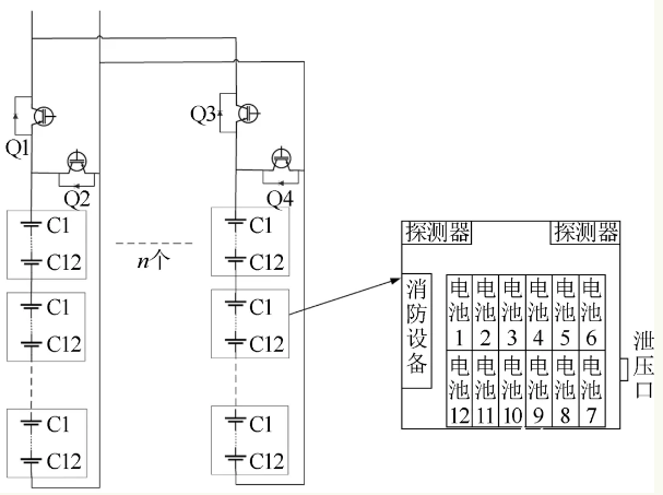 在電池發(fā)生熱失控之后,如何抑制電池的熱蔓延,電池Pack及箱體的安全在儲(chǔ)能系統(tǒng)中就顯得至關(guān)重要。而電池 Pack 的結(jié)構(gòu)和材料、電池Pack的充放電控制以及集裝箱內(nèi)設(shè)備的集成也成為儲(chǔ)能安全的重中之重。文獻(xiàn)針對電池包箱體的結(jié)構(gòu)和材料進(jìn)行優(yōu)化設(shè)計(jì),電池包內(nèi)僅有冷卻水管給電池進(jìn)行降溫,存在較大的安全隱患, 并沒有其他消防安全設(shè)備和探測裝置對可能發(fā)生事故的電池包進(jìn)行有效的檢測與防護(hù)。文獻(xiàn)提出了集裝箱式儲(chǔ)能電池成組技術(shù),分析了電池模組的3種成組方式以及將BMS和磷酸鐵鋰電池進(jìn)行集成,電池采用先串聯(lián)后并聯(lián)模式能夠監(jiān)測到每一塊電池,但會(huì)增大電池管理的成本,由于單體電池SOC的限制,導(dǎo)致儲(chǔ)能系統(tǒng)輸出容量減小。同時(shí)設(shè)備集成考慮的并不全面,仍需要完成與PCS以及協(xié)調(diào)控制器的接線問題,使通信電纜的長度增加,影響到通信的及時(shí)性,而電纜暴露在 空氣中,也會(huì)加劇老化程度。文獻(xiàn)分別研究采用蜂窩式單獨(dú)腔體結(jié)構(gòu)、放熔斷器的鎳帶設(shè)計(jì)等方式和在每個(gè)電池包上對應(yīng)設(shè)置一個(gè)滅火冷卻機(jī)構(gòu)的方式來防止電池?zé)崾Э芈?。這些文獻(xiàn)分別只從物理和化學(xué)方面單獨(dú)來防止熱失控蔓延,措施比較單一,儲(chǔ)能安全存在較大的風(fēng)險(xiǎn)。