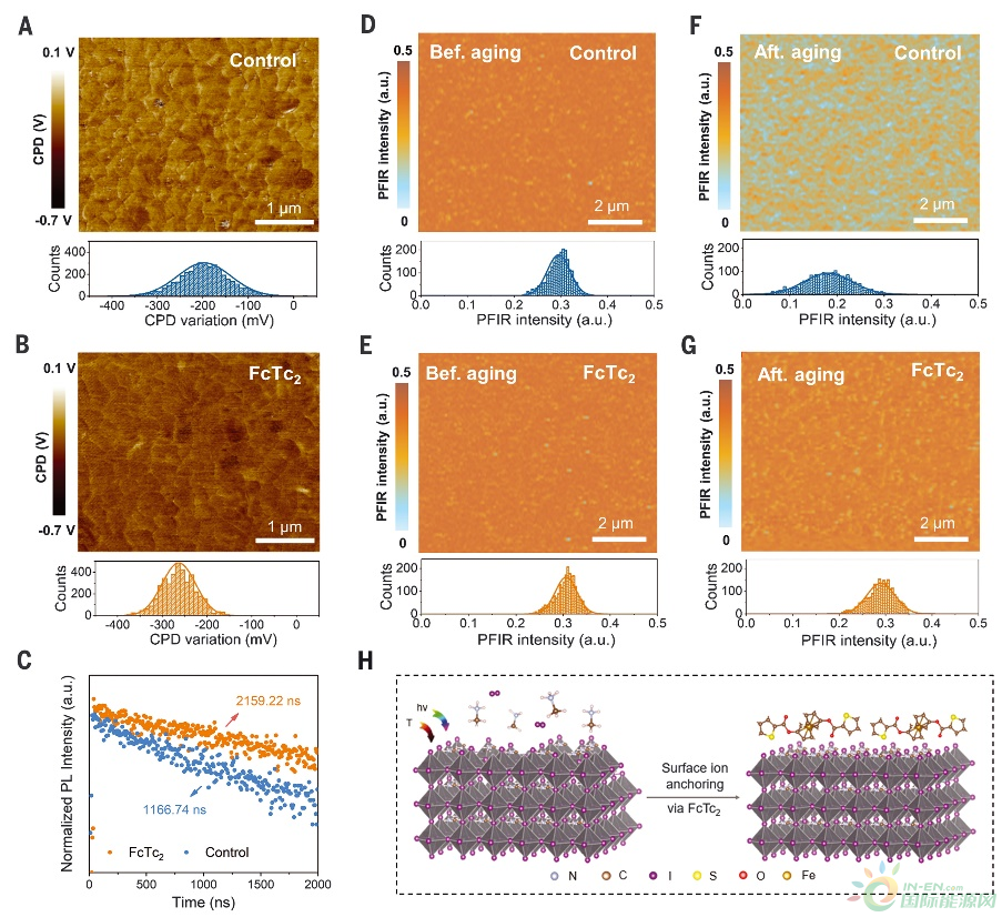 (A-B)通過掃描對(duì)照和FcTc2處理的鈣鈦礦薄膜的KPFM獲得表面電位圖像。