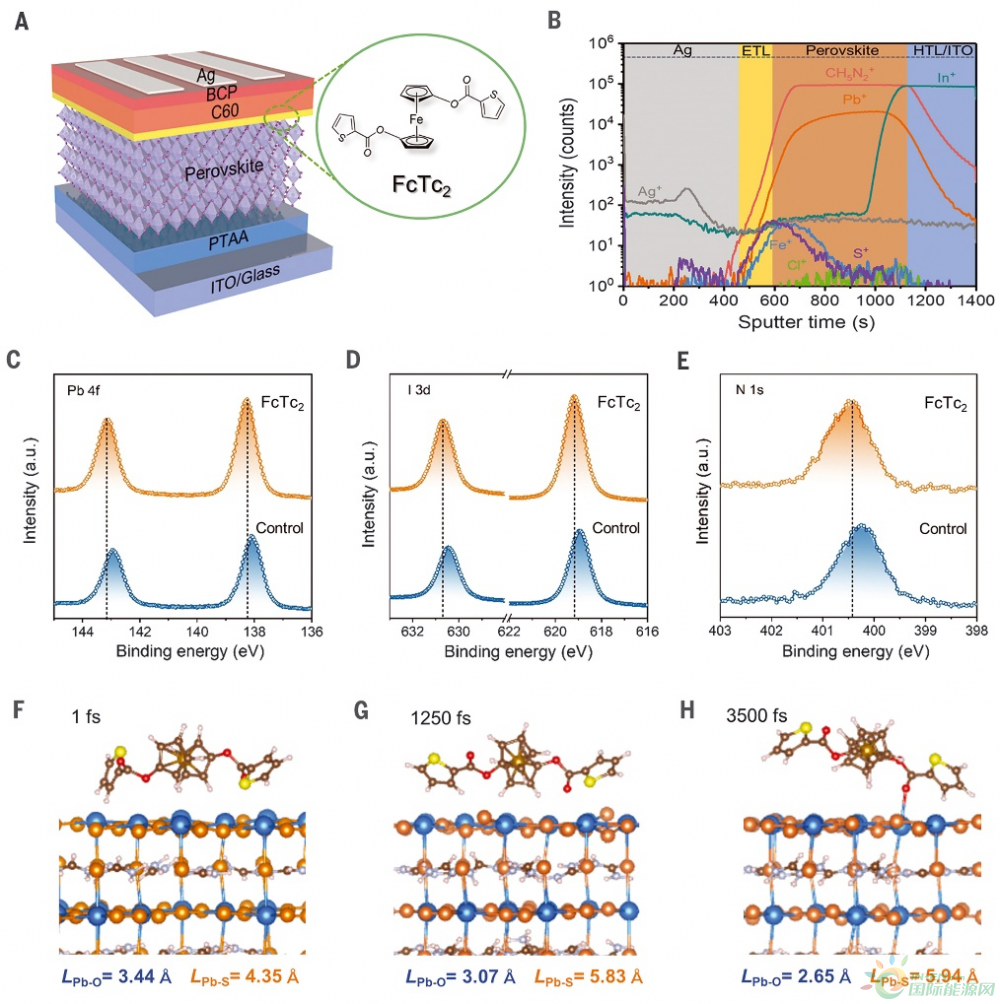 1、通過引入FcTc2,其中的有機(jī)官能團(tuán)有效地鈍化了鈣鈦礦表面上未配位的鉛離子引起的缺陷,同時(shí)由于二茂鐵基團(tuán)的富電子及其可離域的特性極大限度地提高了鈣鈦礦界面間的電荷傳輸速度。