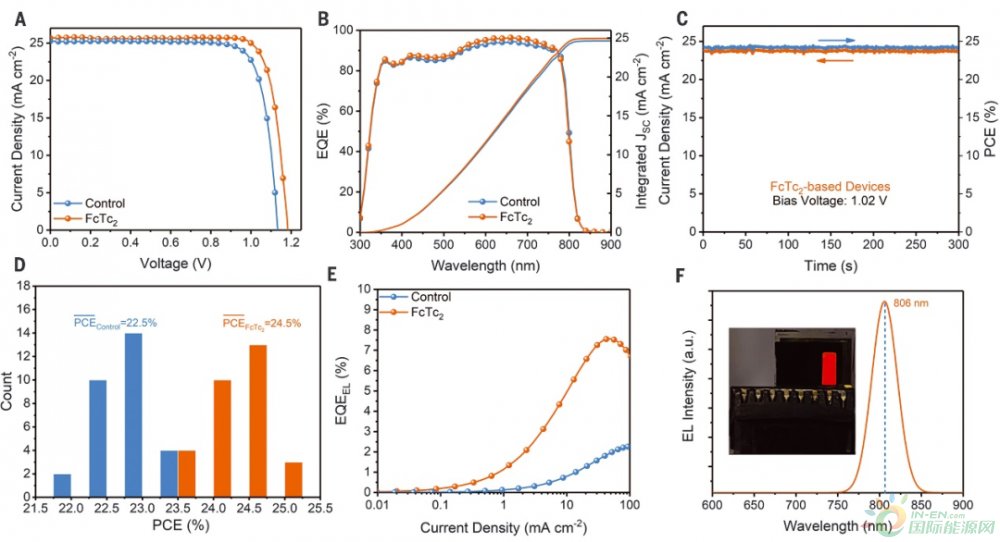 2、通過FcTc2界面修飾后的器件,其短路電壓(VOC)以及填充因子(FF)得到了較大的提升,實(shí)驗(yàn)室測(cè)試效率達(dá)到了反式鈣鈦礦太陽能電池記錄效率25%(認(rèn)證效率為24.3%)。