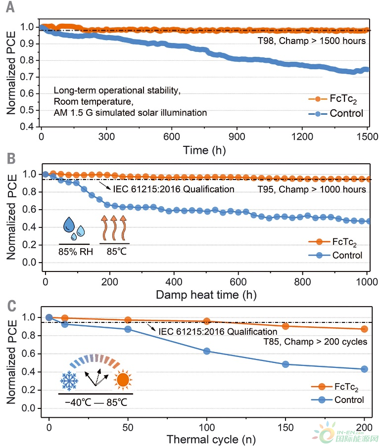 3、FcTc2界面修飾后的器件展現(xiàn)了優(yōu)異的穩(wěn)定性,在長期光照運(yùn)行1500小時(shí)后仍維持在初始效率的98%,在濕熱環(huán)境下(85℃/85% RH)的穩(wěn)定性測(cè)試通過了IEC61215:2016的國際標(biāo)準(zhǔn)。
