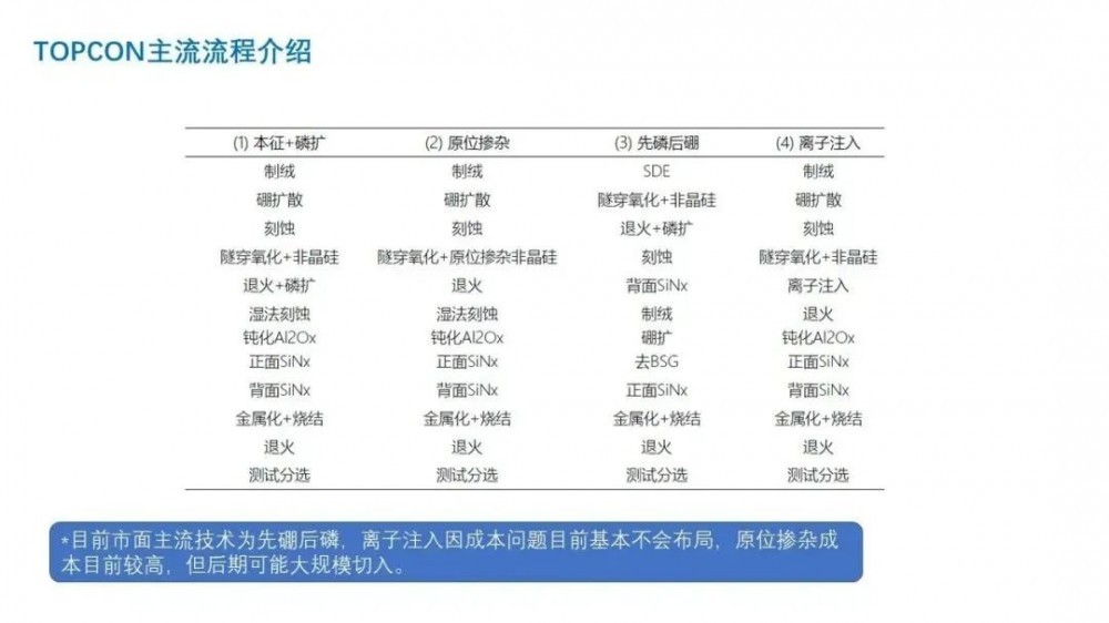 從電池制備環(huán)節(jié)看,TOPCon相比PERC增加/替換的主要設(shè)備為B擴(kuò)散、隧穿氧化層及poly Si沉積設(shè)備,其余環(huán)節(jié)基本與PERC產(chǎn)線兼容。光伏設(shè)備專家介紹,老舊PERC產(chǎn)能改擴(kuò)建TOPCon,可采用管式LPCVD+磷擴(kuò);或者PECVD原位摻雜技術(shù)路線。近兩年新建大尺寸PERC 產(chǎn)線,一般預(yù)留TOPCon空間,可采用PECVD/PVD原位摻雜技術(shù)路線。