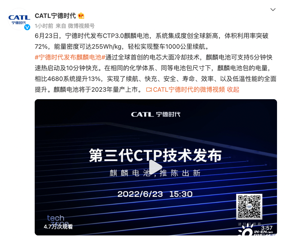 6月23日,寧德時(shí)代正式舉行了“麒麟電池,推陳出新”第三代CTP技術(shù)新聞發(fā)布會(huì),正式發(fā)布了CTP3.0麒麟電池,系統(tǒng)集成度創(chuàng)全球新高,體積利用率破72%,能量密度可達(dá)255Wh/kg,可實(shí)現(xiàn)整車1000公里續(xù)航,將于2023年量產(chǎn)上市。