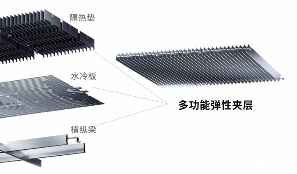 寧德時(shí)代指出,CTP3.0麒麟電池開創(chuàng)性地取消了橫縱梁、水冷板與隔熱墊原本各自獨(dú)立的設(shè)計(jì),集成為多功能彈性?shī)A層,提高系統(tǒng)集成效率。