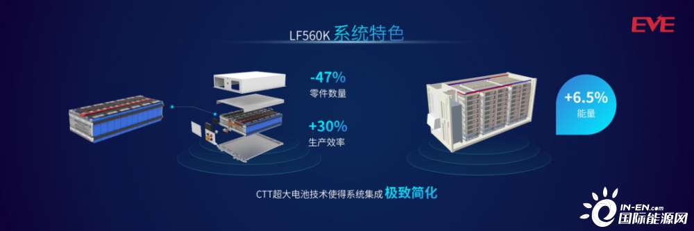 在系統(tǒng)集成的應(yīng)用中,相較于LF280K電池,使用LF560K電池可減少電芯數(shù)量50%、簡化Pack零部件數(shù)量47%,提升生產(chǎn)效率30%。此外,通過簇級別尺寸的優(yōu)化,可提高集裝箱電量6.5%,完美適配行業(yè)標(biāo)準(zhǔn)集成方案,降低客戶使用成本。