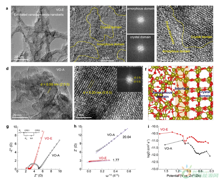 采用電化學循環(huán)伏安方法在碳電極表面沉積氧化釩納米帶材料,其結晶度低。借助高分辨透射電子顯微手段,作者發(fā)現(xiàn)電極材料內部存在大量無定型與納米結晶區(qū)域,形成豐富的無定型-結晶異質界面網(wǎng)絡。這與純結晶態(tài)氧化釩具有顯著區(qū)別。這種新穎的異質界面網(wǎng)絡,可實現(xiàn)高效電荷傳遞,加速電子、離子在電極表面的電荷轉移及電極內部的輸運。因此,無定型-結晶異質結構氧化釩材料表現(xiàn)出優(yōu)異的電化學性能,例如高質量/面積比容量(516 mAh g-1,~5 mAh cm-2),良好的循環(huán)穩(wěn)定性,以及良好的低溫適用性。