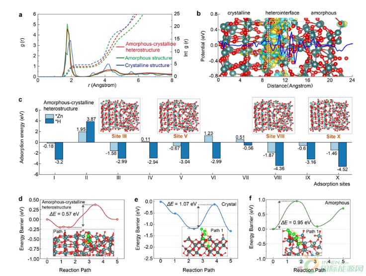 DFT理論計算及分子動力學模擬顯示,無定型-結晶異質結構的V-O配位環(huán)境與純無定型或結晶態(tài)材料不同。界面處電荷分布不均,形成局域電場,可能加速界面處電荷傳遞。此外,由于界面處原子重拍,異質結構電極表面具有更多的端基氧,利于Zn2+/H+離子的吸附。比之純相樣品,異質界面模型的離子遷移能壘更低,這表明Zn2+/H+在無定型-結晶界面處具備更快的傳質動力學。